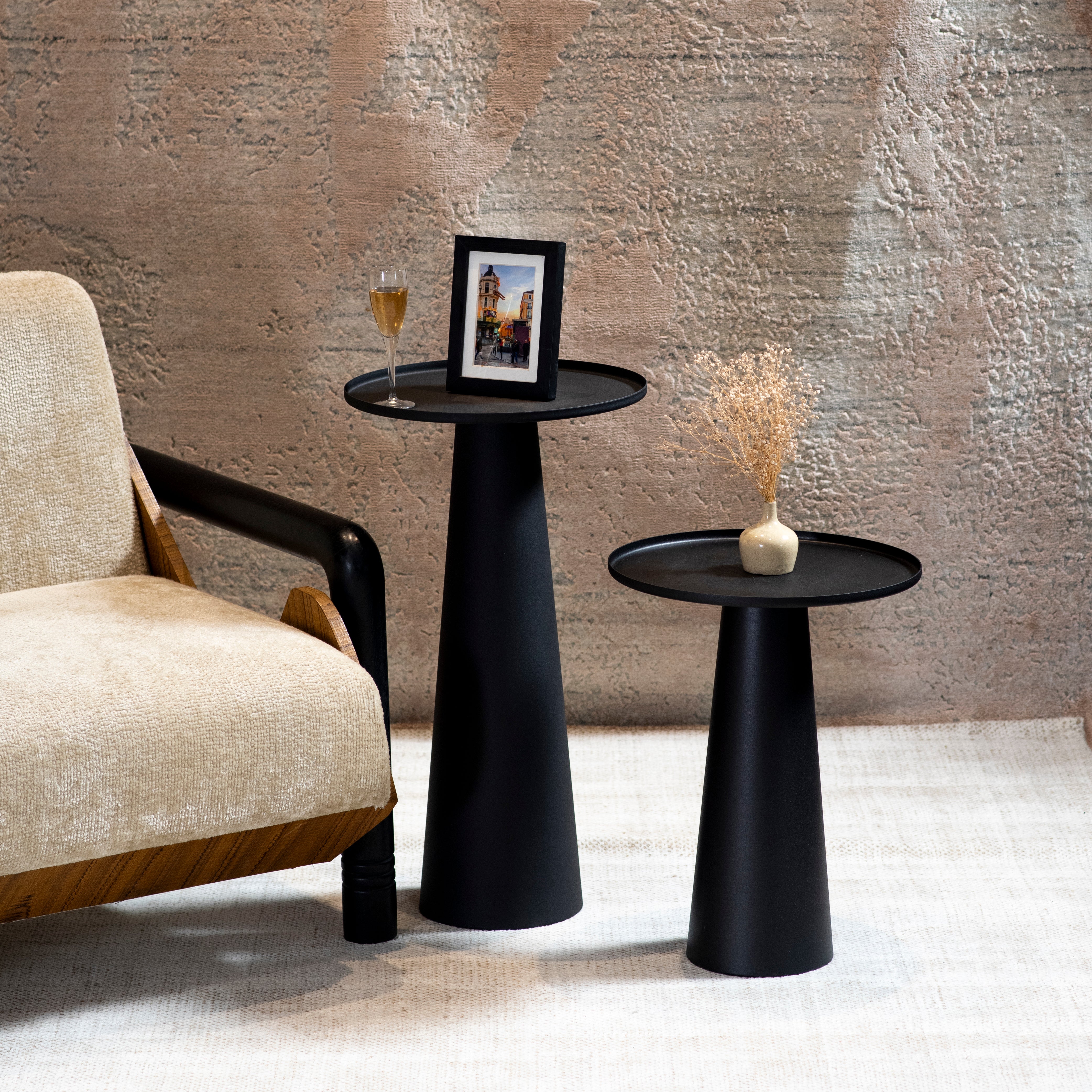 A table that moves with you between a lively gathering and a quiet evening corner. Matt black, sculpted and sleek, designed to hold your drinks, books, or flowers with effortless style. Pair with the taller Brie or let it stand alone, a modern accent that feels at home anywhere.